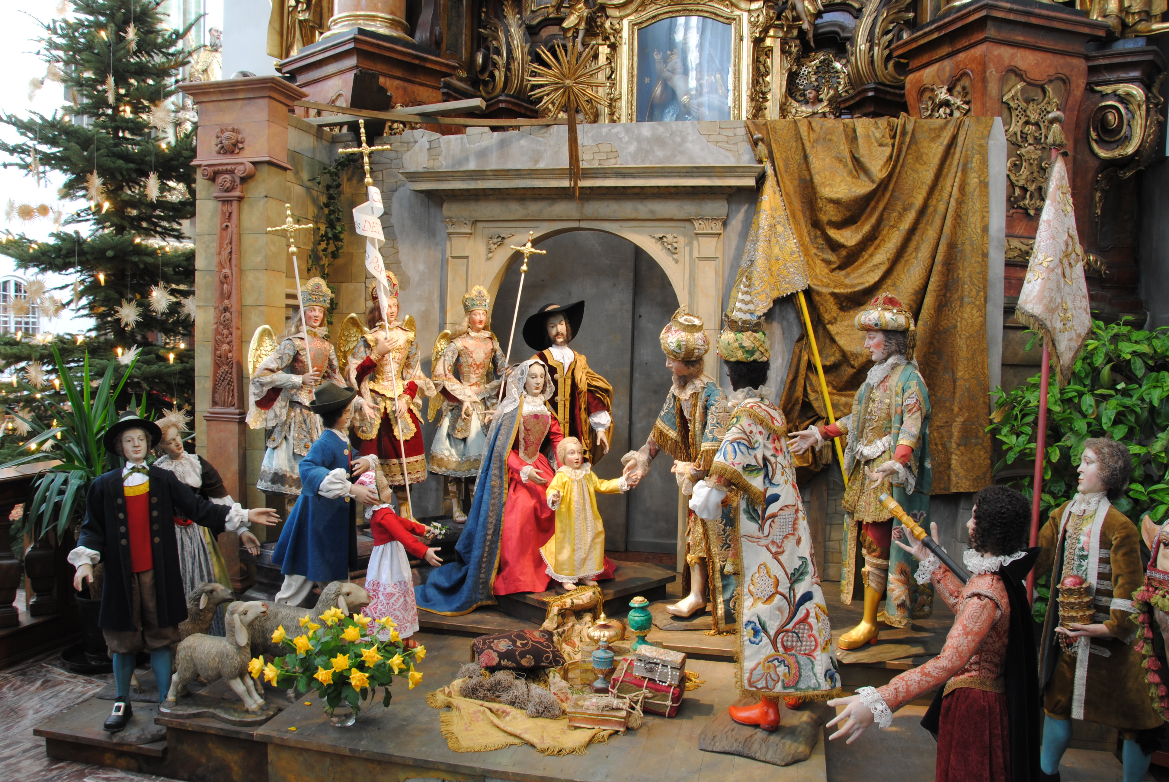 Seit dem Umzug der Marianischen Männerkongregation von der Jesuiten- in die spätgotische, um 1700 barockisierte Karmelitenkirche gehörte 1814 die große Barockkrippe vor dem Sebastianialtar (vorne rechts) dem Kloster. Erste Nachrichten über diese typische Jesuitenkrippe tauchen 1638 und 1646 auf. 44 Köpfe für Meterfiguren und 42 Paar Hände sind erhalten. Seit 1997 entstanden Rekonstruktionen von 24 fast menschengroßen Barockfiguren; dazu zehn Tiere und ein großer Hintergrundbau. Mit dem ersten Advent beginnen die Szenen: Verkündigung an Maria, Gang zur Base Elisabeth, Herbergssuche, Heilige Nacht, Königsanbetung, Flucht nach Ägypten. Rekonstruktion, Bekleidung und Bauten schufen E. und F. Karl. Seit einigen Jahren werden alle Krippenszenen der Karmeliten von Günther Neumann gestaltet, teils mit neuen Motiven und Bauten.